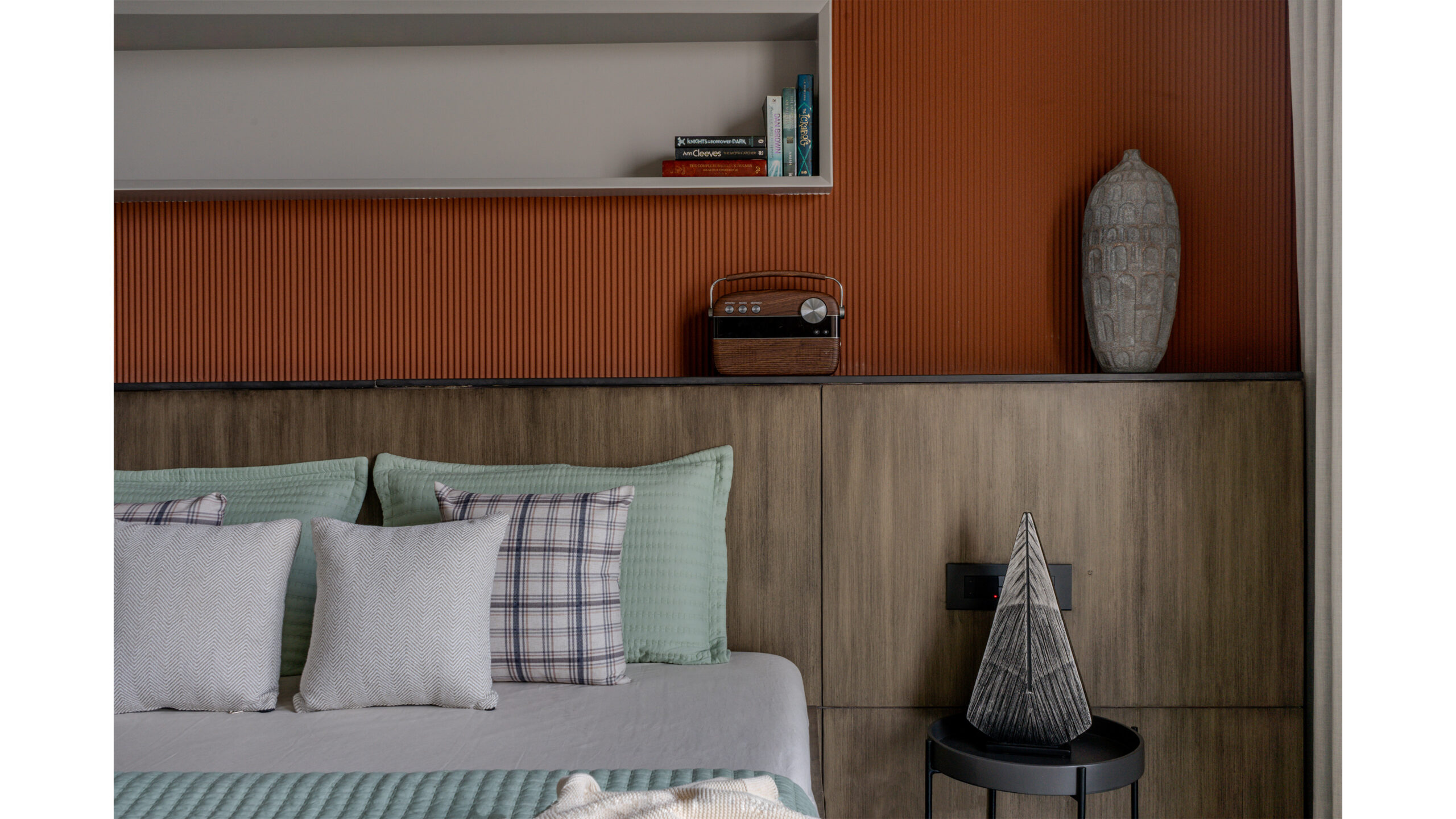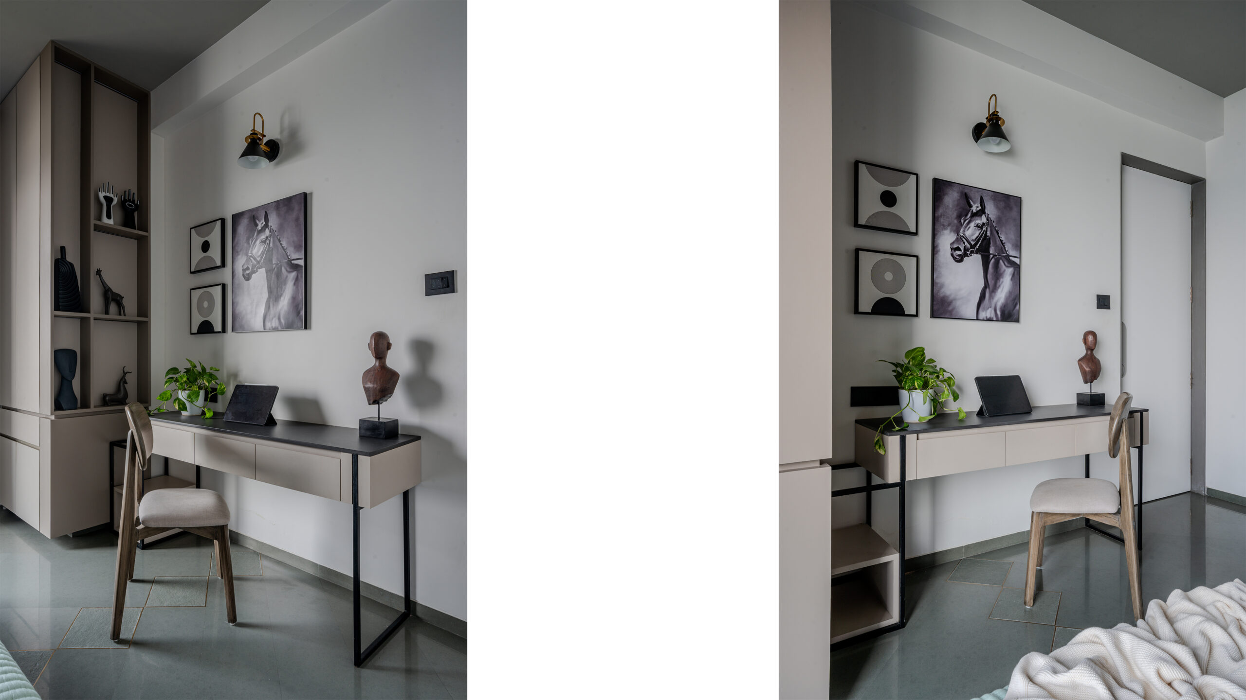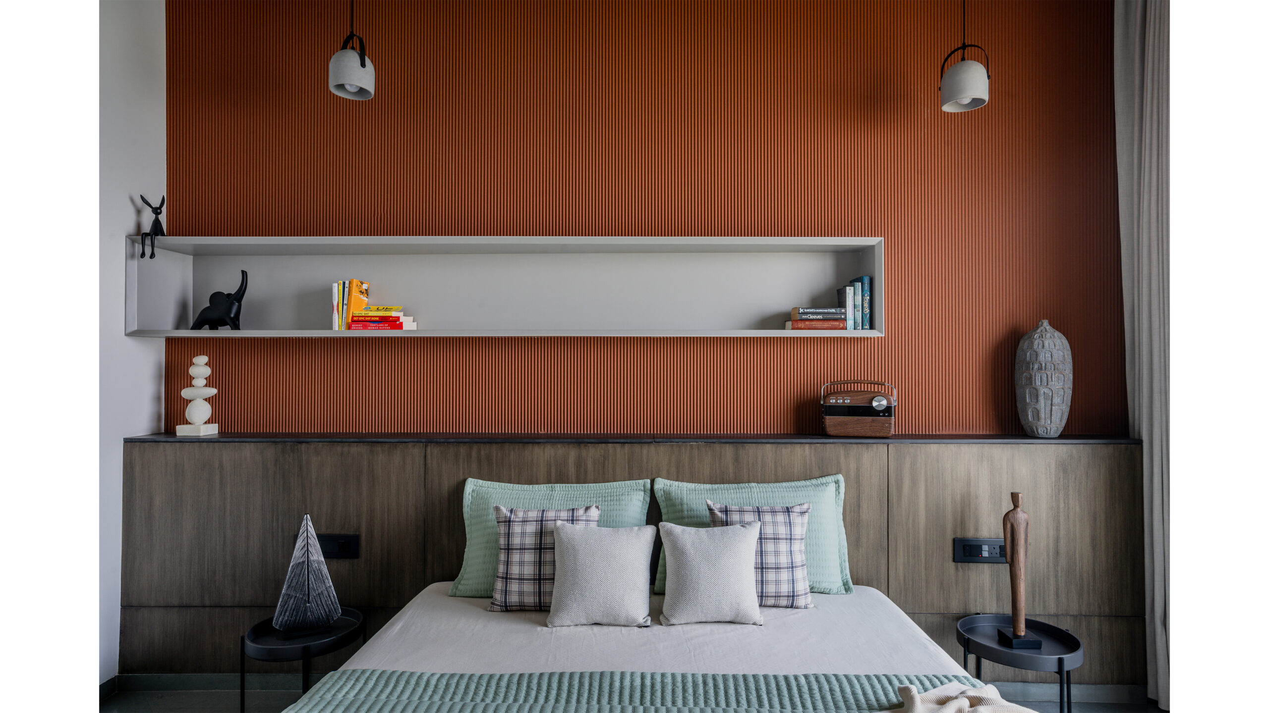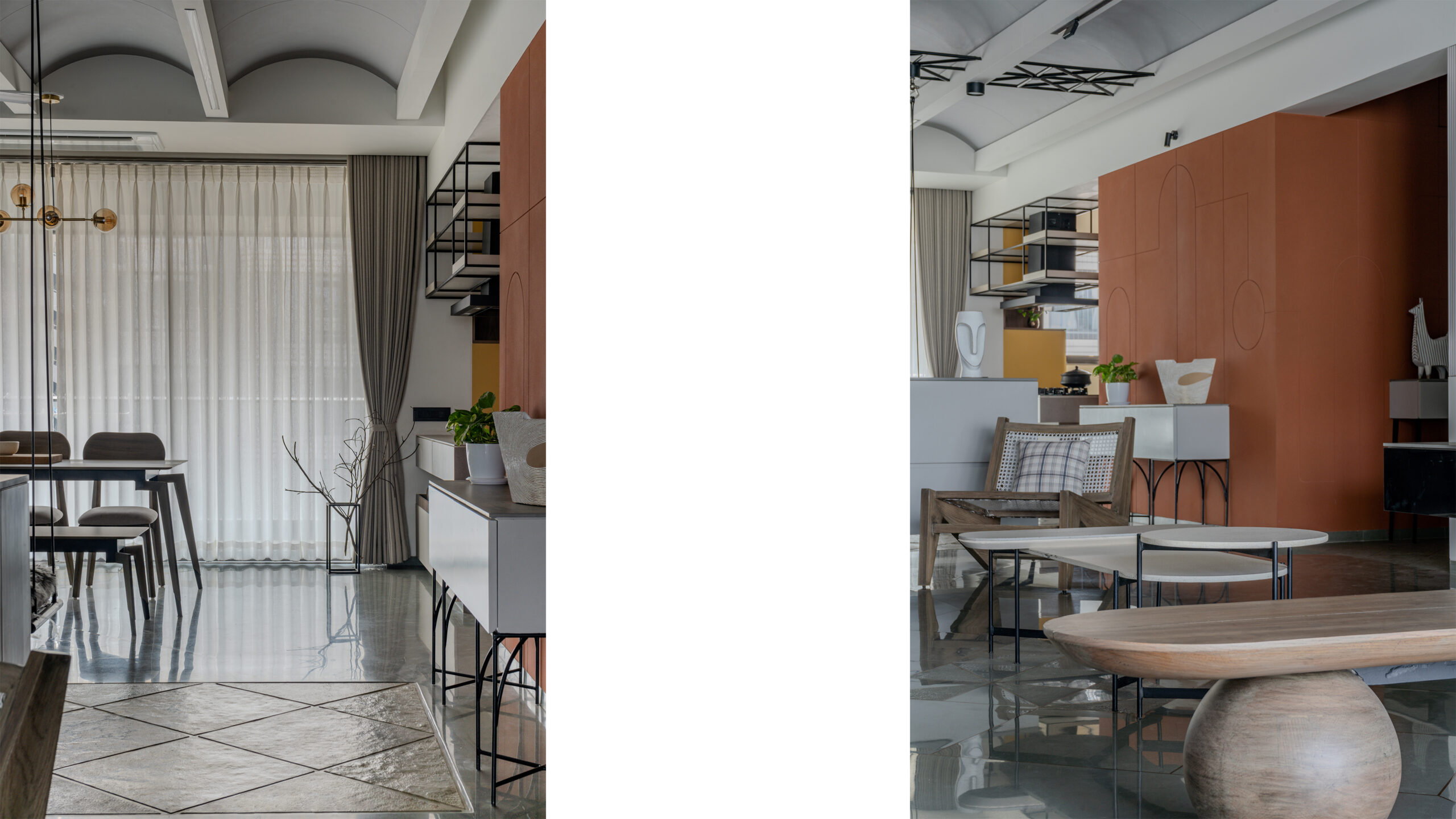 The entrance, a prelude to the journey within, is conceived as an art gallery. The moment the door opens, a red sand dunes texture stretches across the walls, evoking raw, elemental landscapes. This tactile surface wraps around to the kitchen, guiding movement and perspective, drawing one deeper into the core of the home.