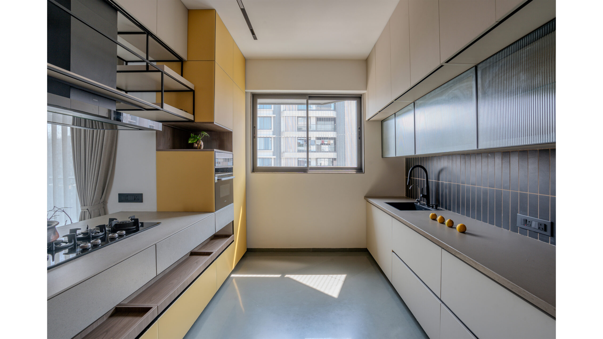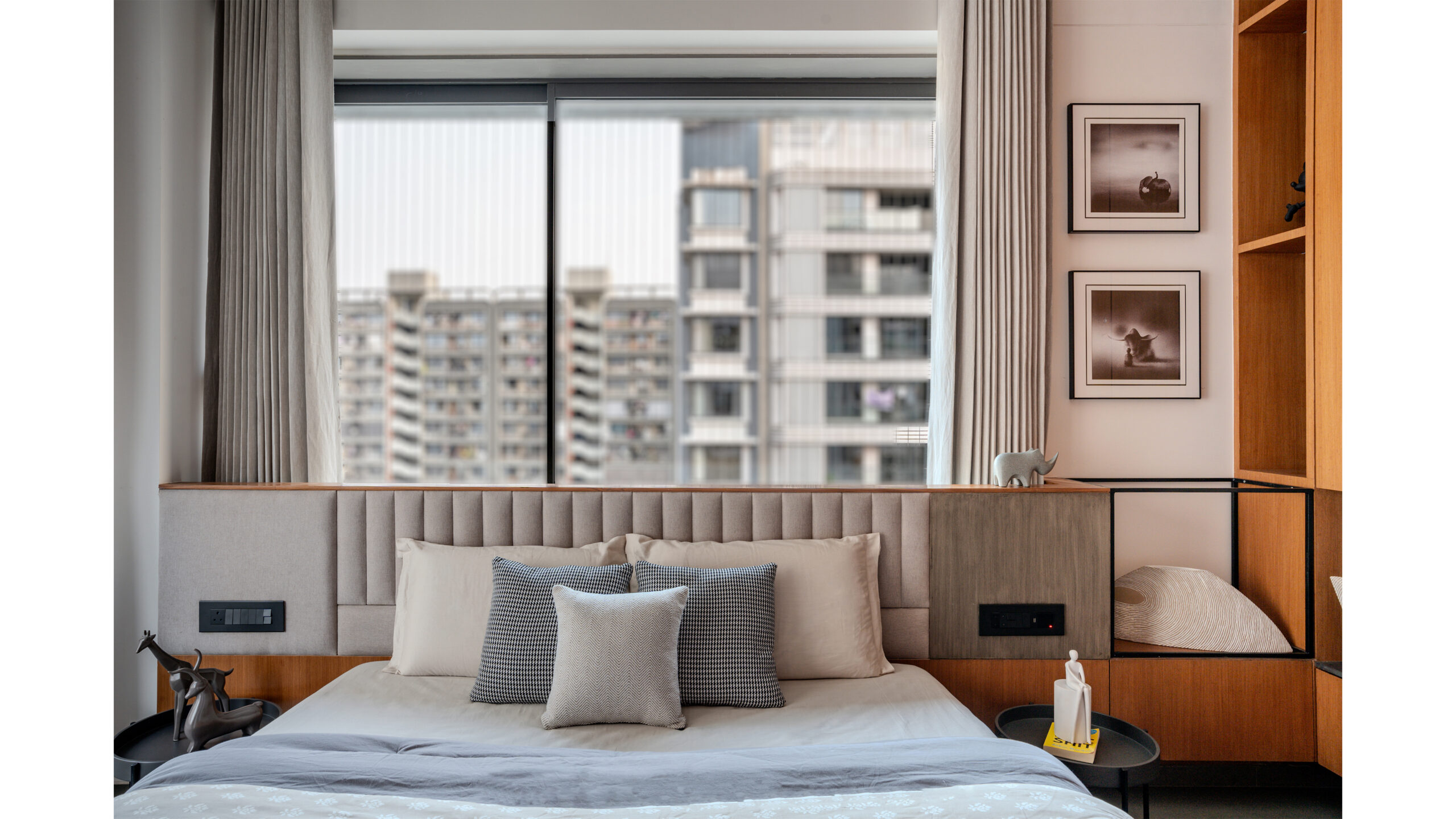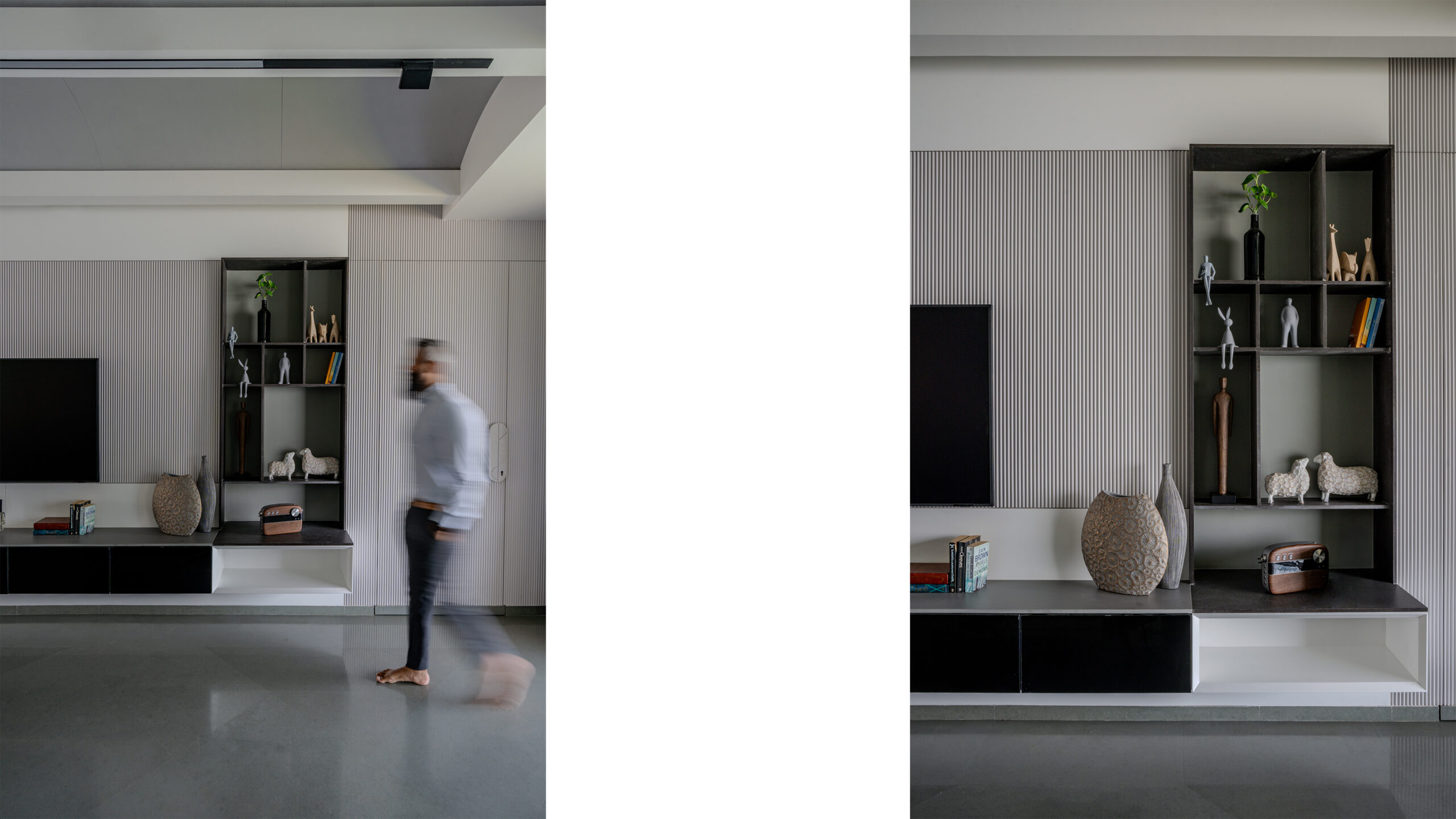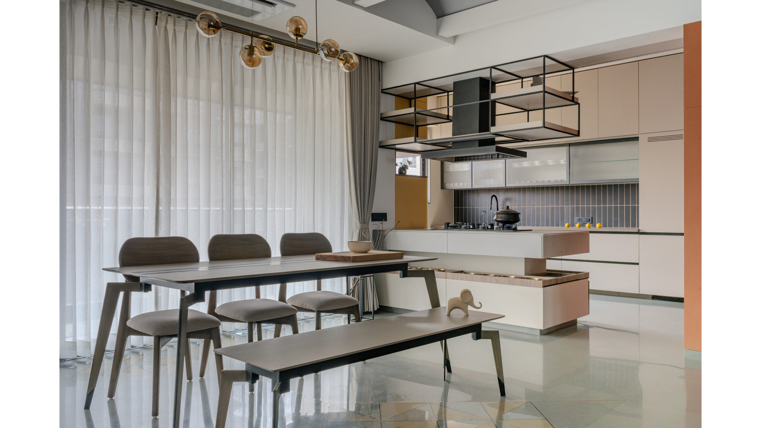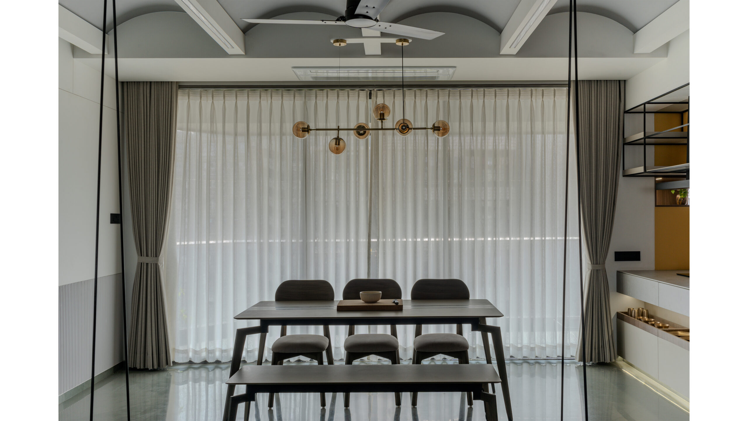 At the heart of the space, an open floor plan allows for the free interplay of light, shadow, and view. The river is always present, unfolding like a living mural through the expanse of glass. The living room, which opens seamlessly onto the deck, becomes an extension of the river itself. The deck’s ceiling, a sculptural fabric installation in a wave pattern, moves with the breeze, animating the space with the fluidity of water, mimicking the gentle flow of the Tapi below.
