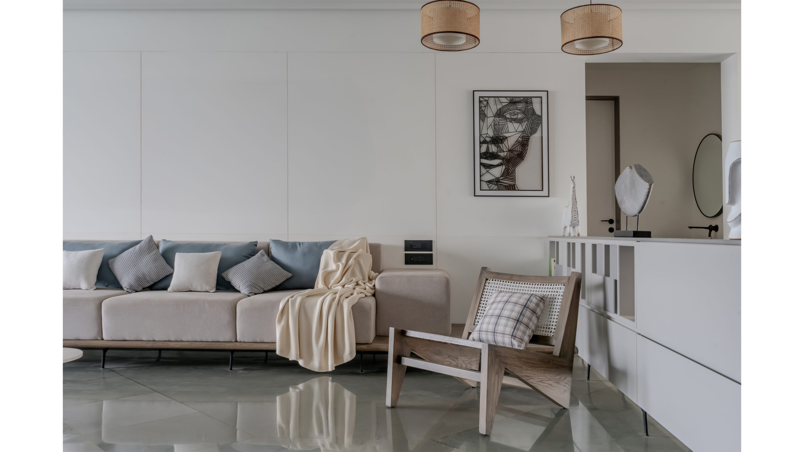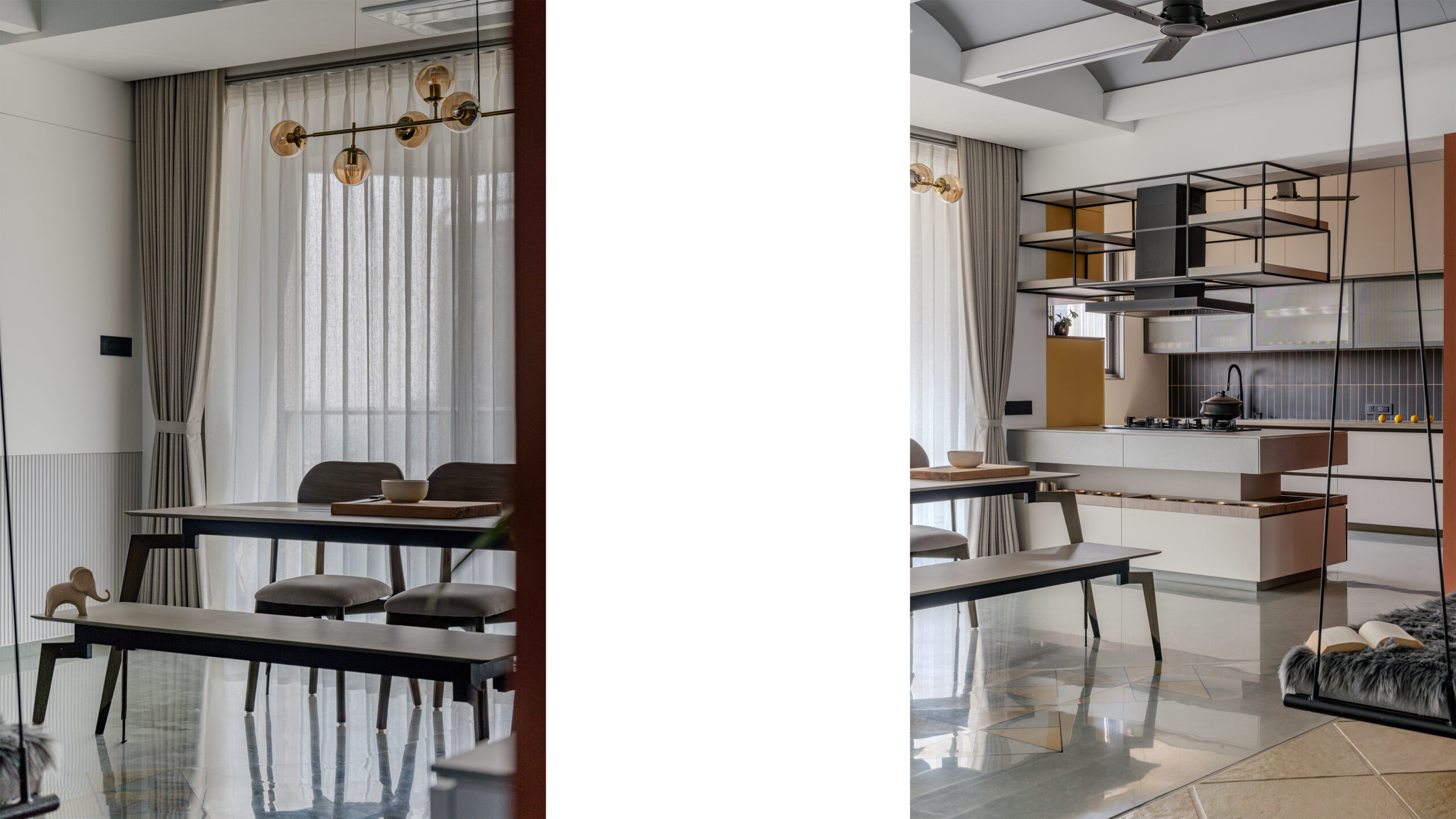 Underfoot, Kota stone, honed to its natural finish, grounds the interior in tactility. Each step connects the resident to the earth, a sensory reminder of the natural world that permeates the design. In the informal area between the living and dining, river-finished golden Kota stone is laid diagonally, framing a swing — an element of playful suspension, movement against the stillness of stone.
